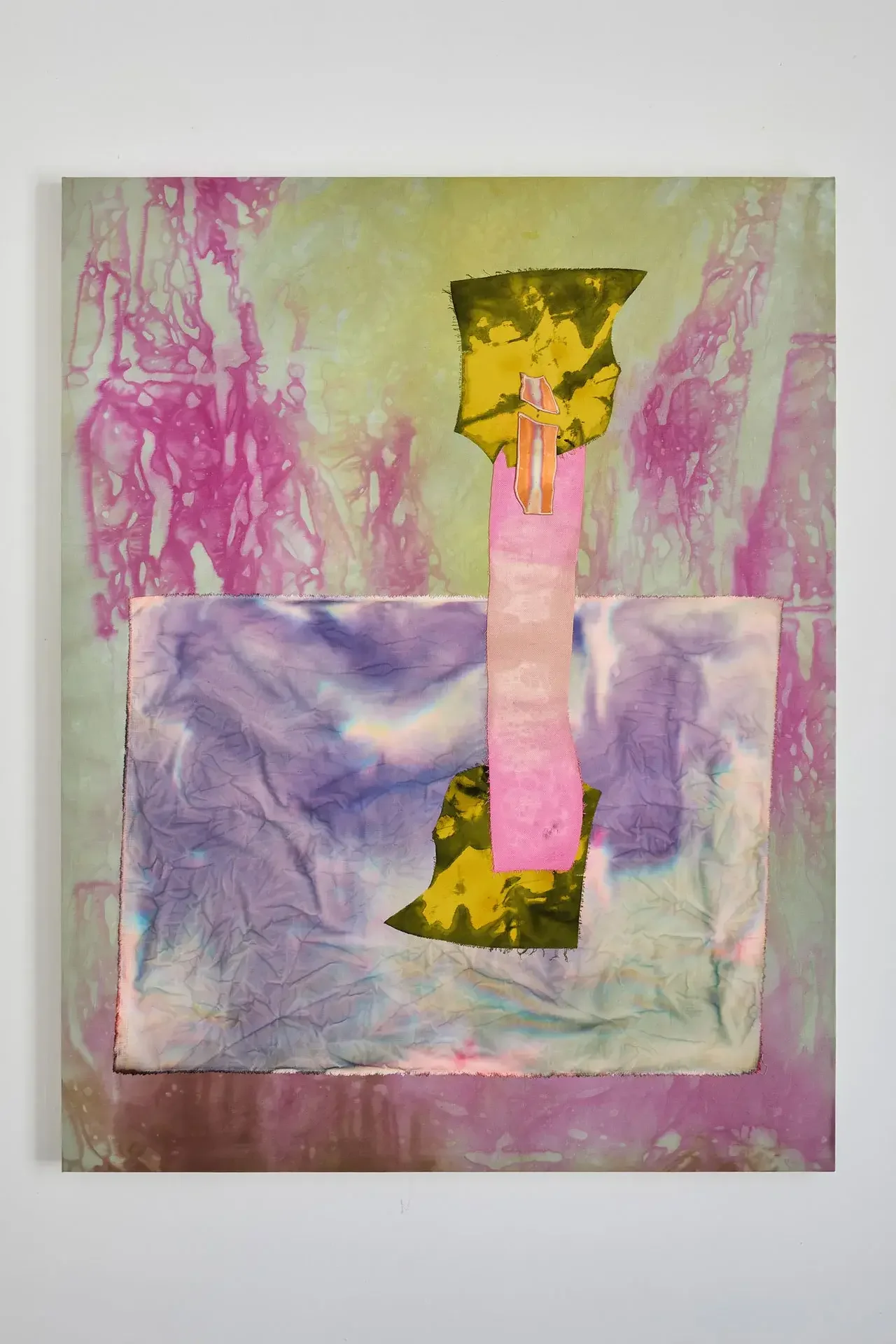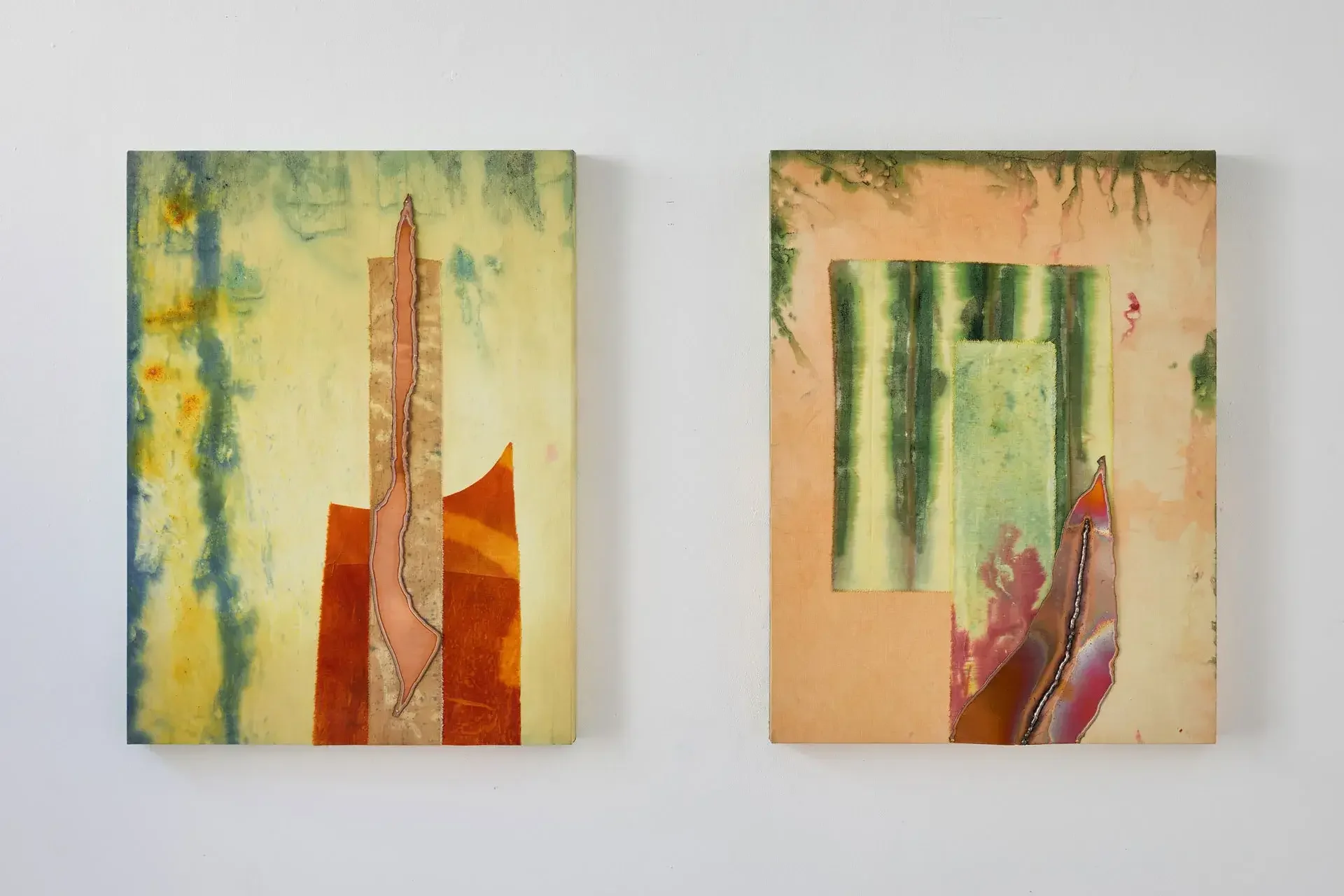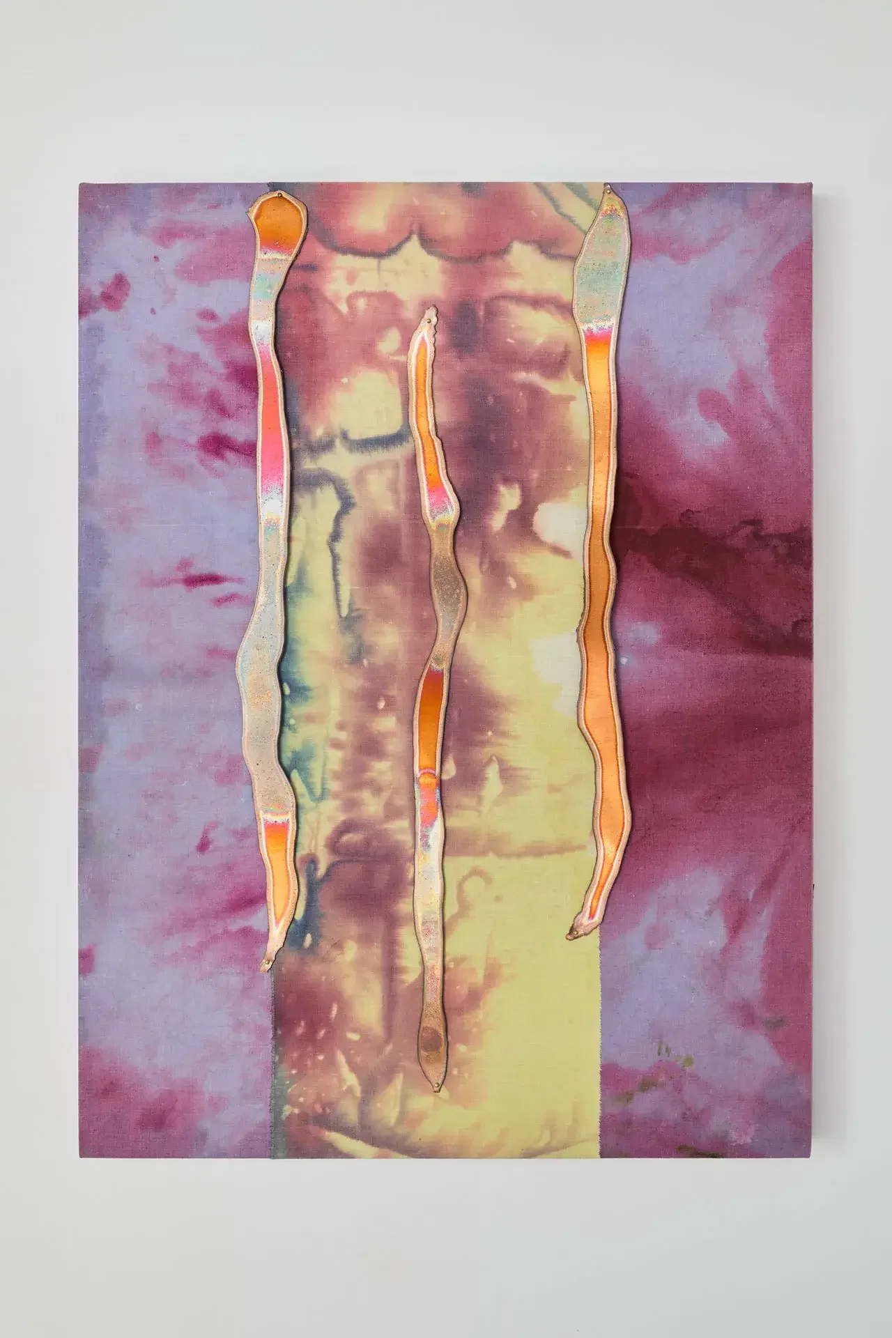This ambivalence is expressed through paintings combining stretched dyed fabrics and burnt copper or brass. This Fire That Licks the Landscape, which spans over two meters, offers an ambiguous immersion into a twilight scene dominated by crimson red, lime green, fuchsia pink, and scorched copper, all set against a faded celestial blue expanse.