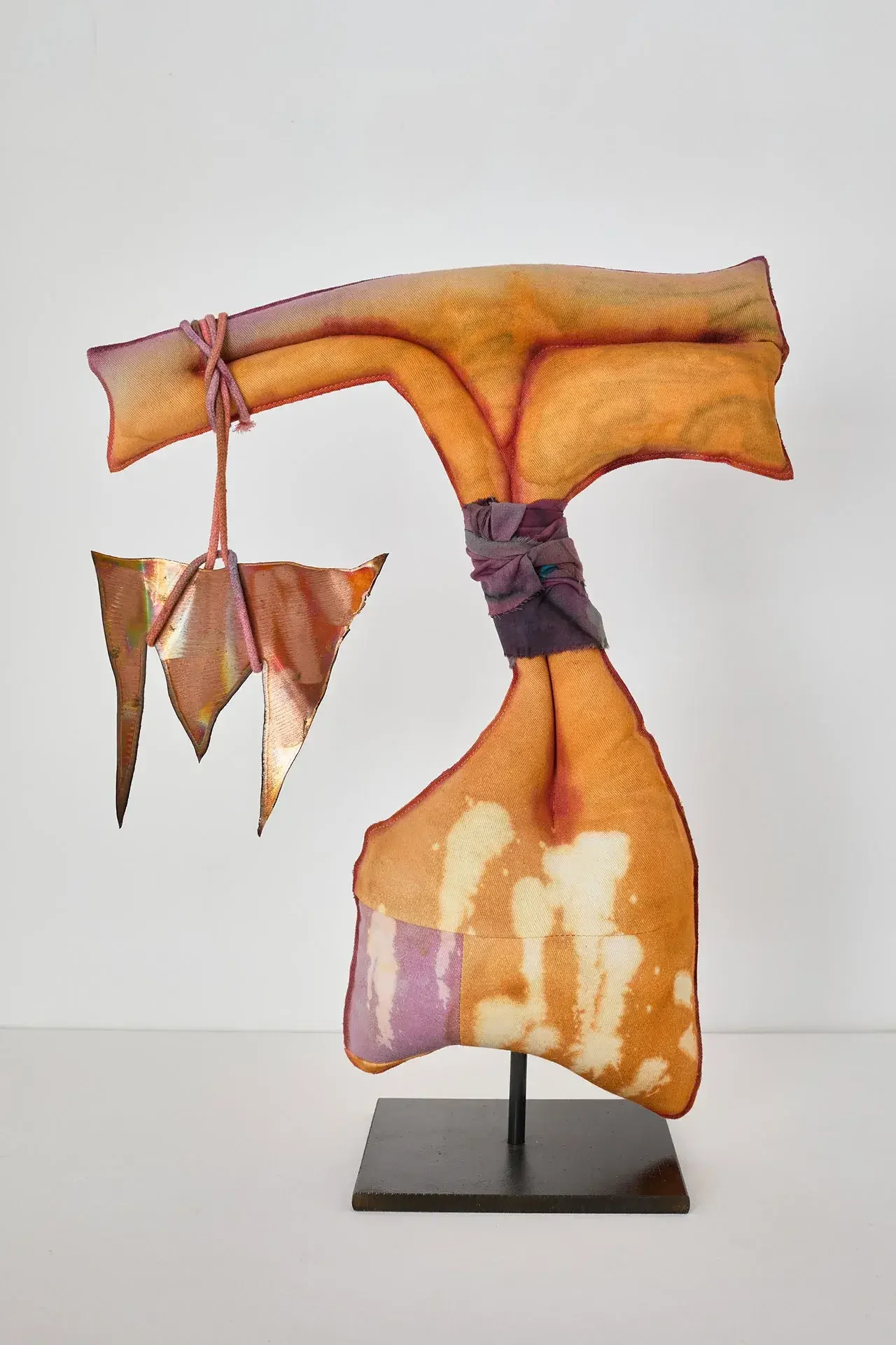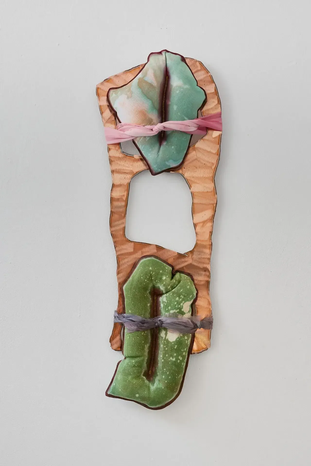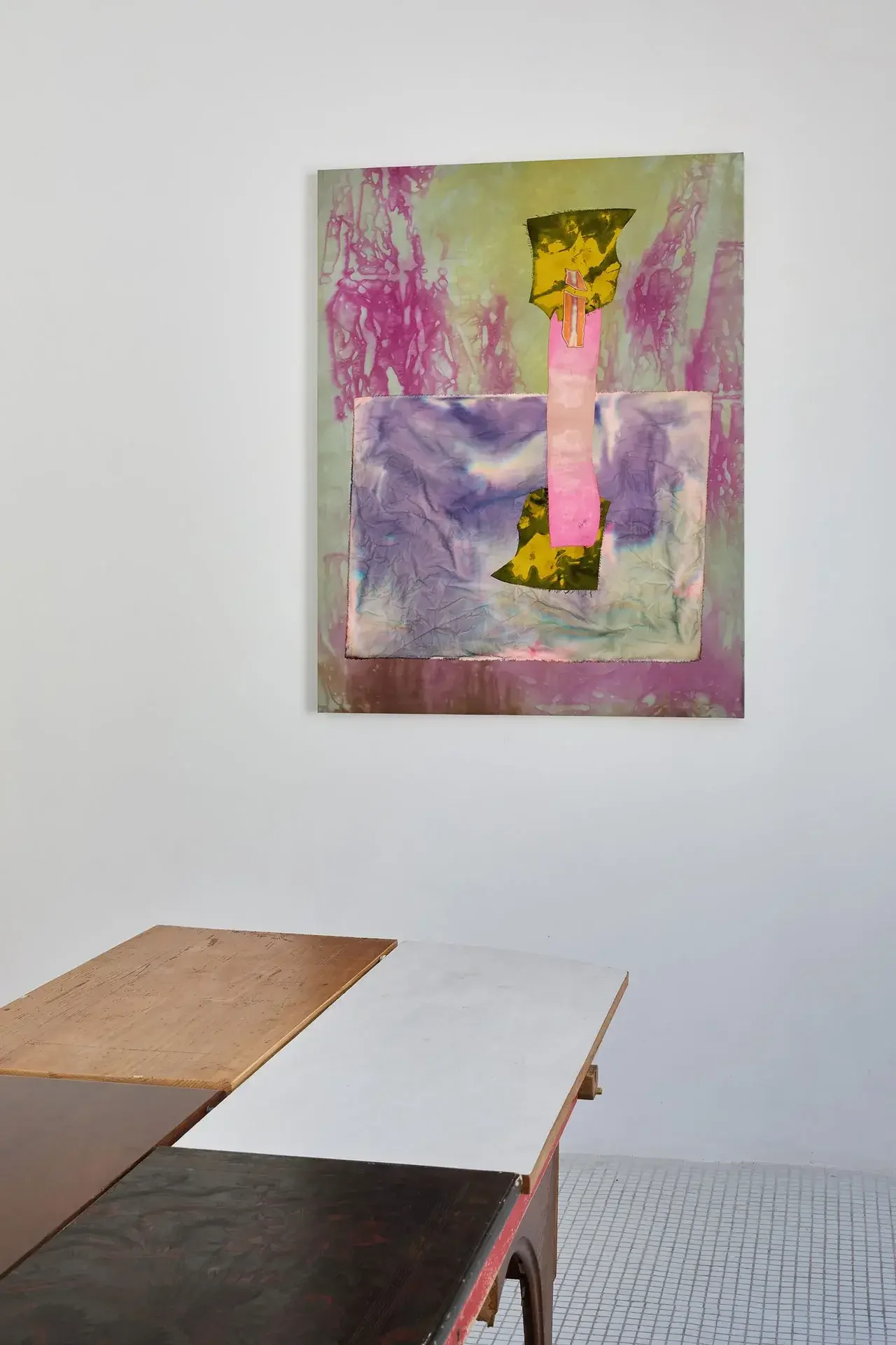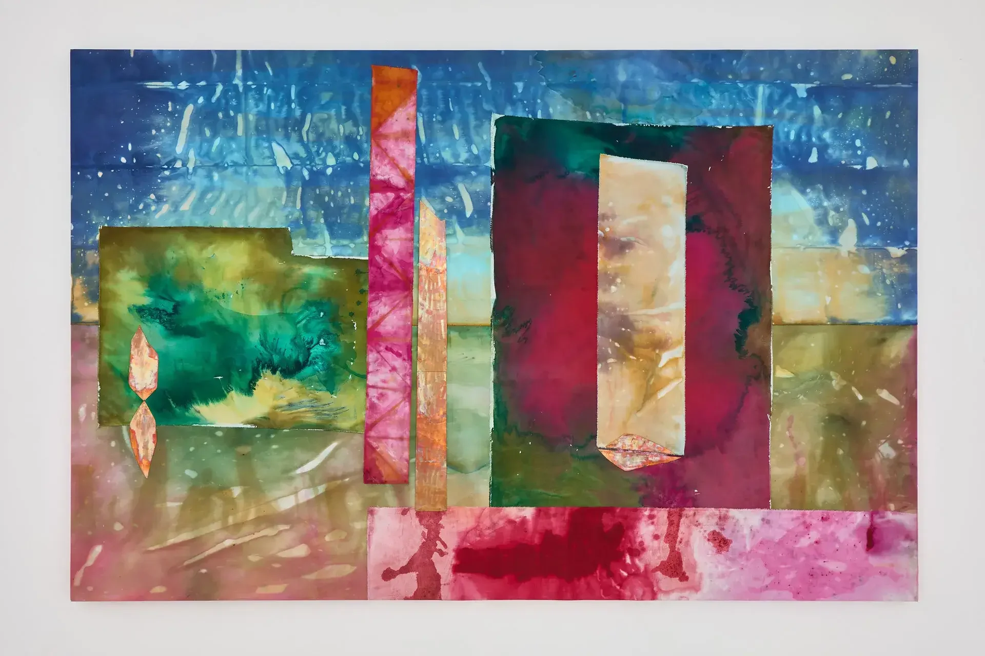 This ambivalence is expressed through paintings combining stretched dyed fabrics and burnt copper or brass. This Fire That Licks the Landscape, which spans over two meters, offers an ambiguous immersion into a twilight scene dominated by crimson red, lime green, fuchsia pink, and scorched copper, all set against a faded celestial blue expanse.