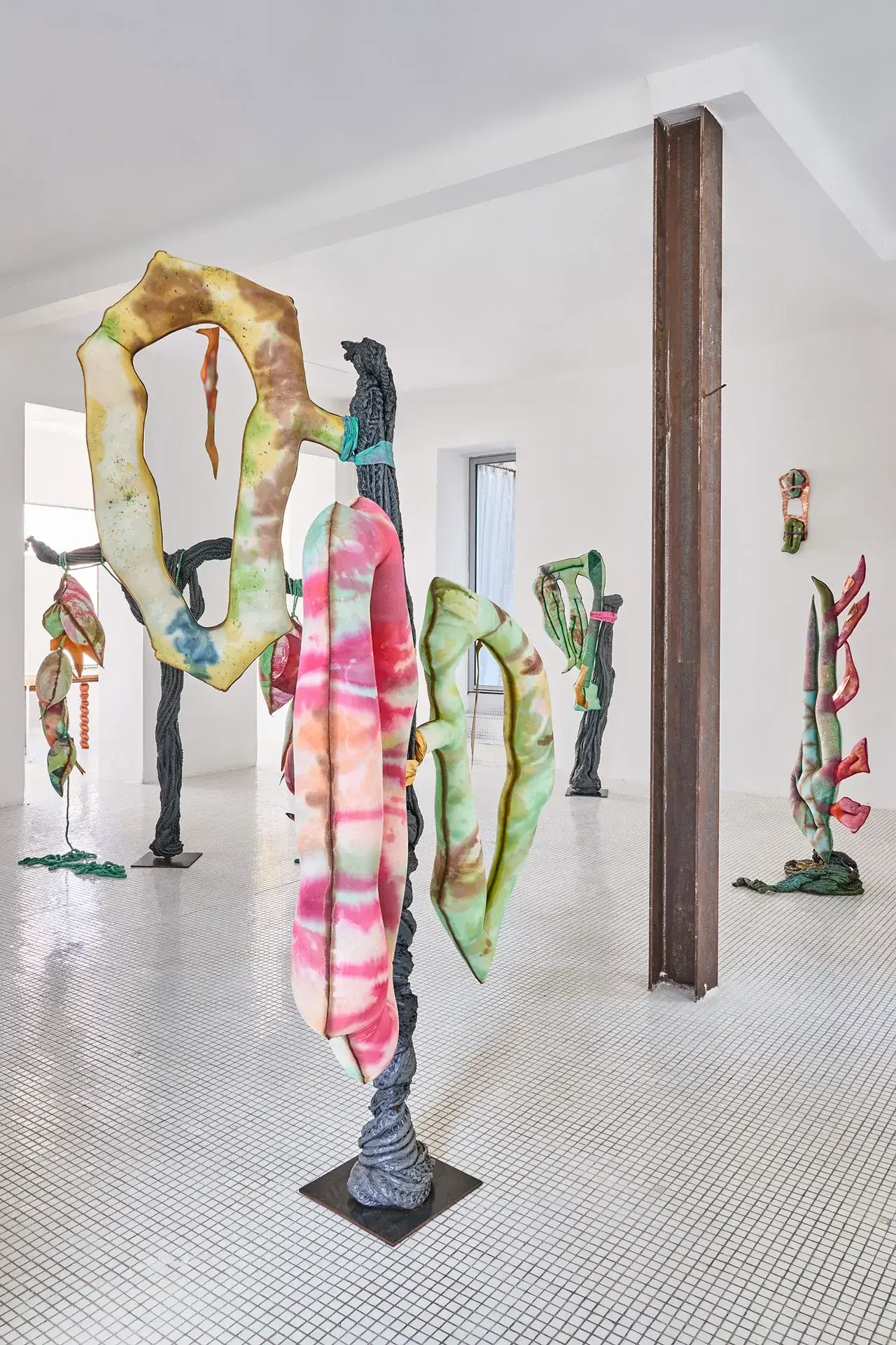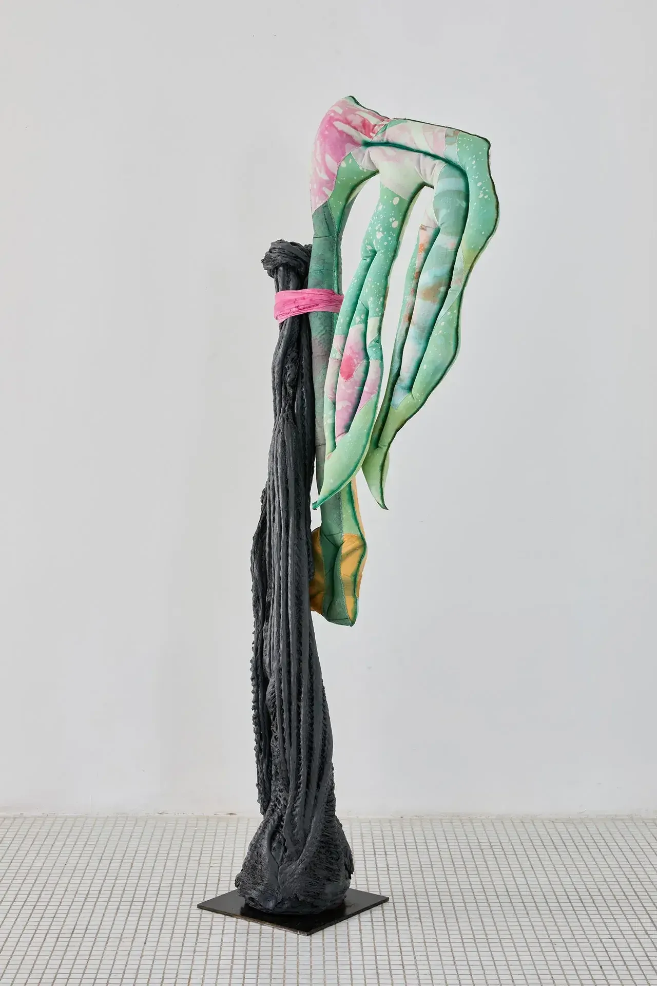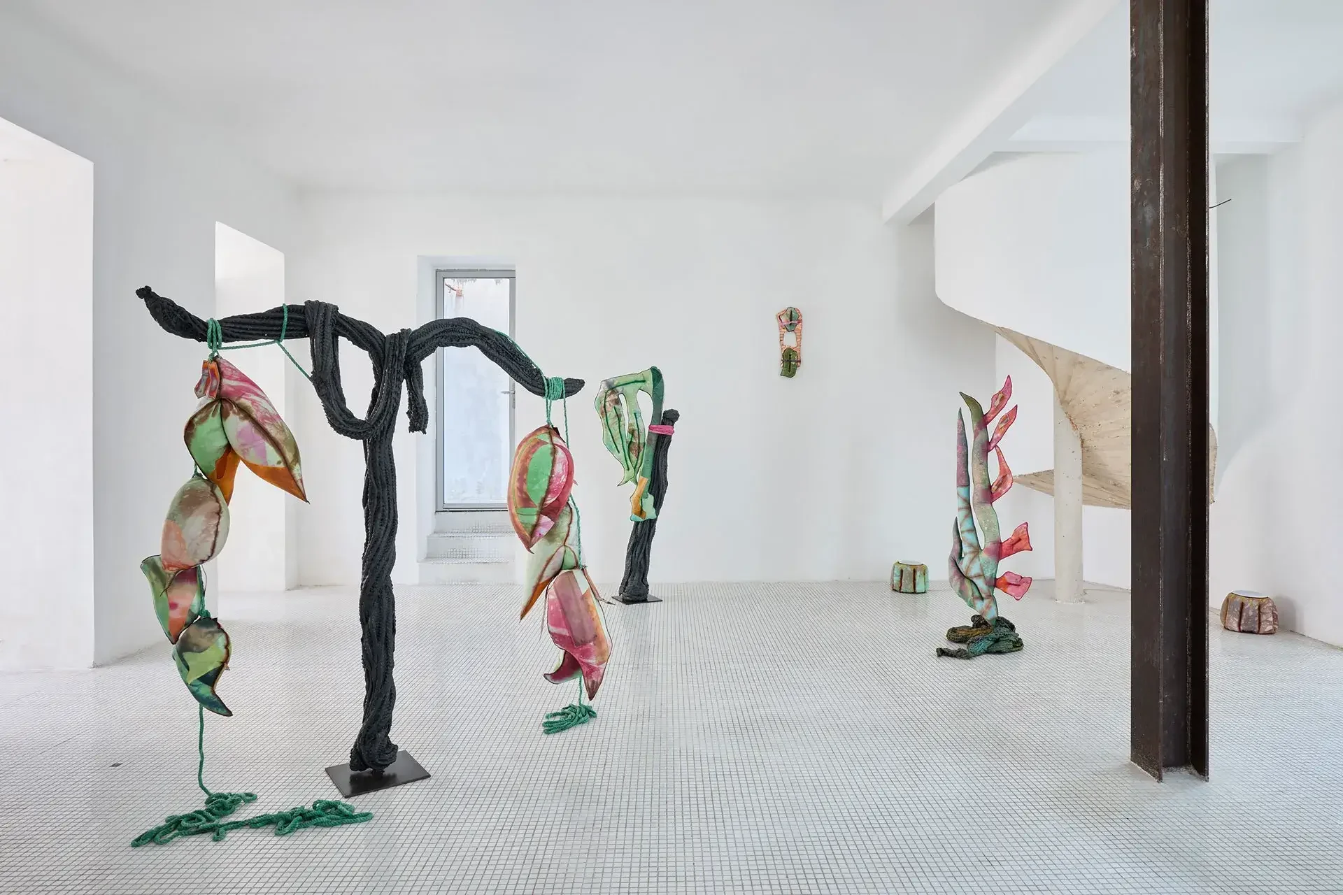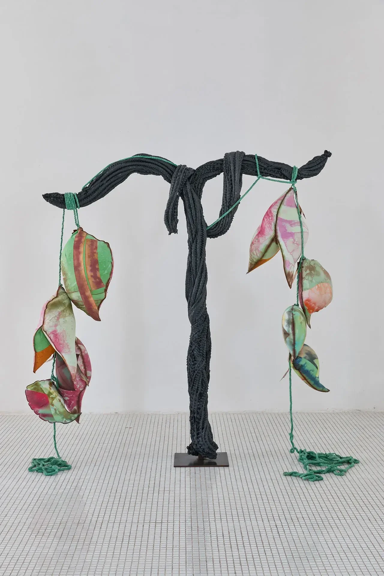 The sculptures invoke fertility through aerial seeds, made from textiles inflated with expanding foam — disproportionate and almost exaggeratedly swollen in the space usually reserved for branches. The black trunks supporting them are made of recycled PVC, hot-molded immediately as it leaves the extruder. Guruceaga contorts their rubbery, reptilian texture, recalling the grimly contemporary image of a vehicle tire melted onto asphalt. Seeds (flowers or fruits) and trunks are connected by strips of fabric or suspended ropes, creating an assemblage aesthetic that evokes a body in remission, while the artist employs a surgical and biological lexical field in her titles: La Greffe (The Transplant), 3 Embryos Fire, 2 Hearts 2 Knots.