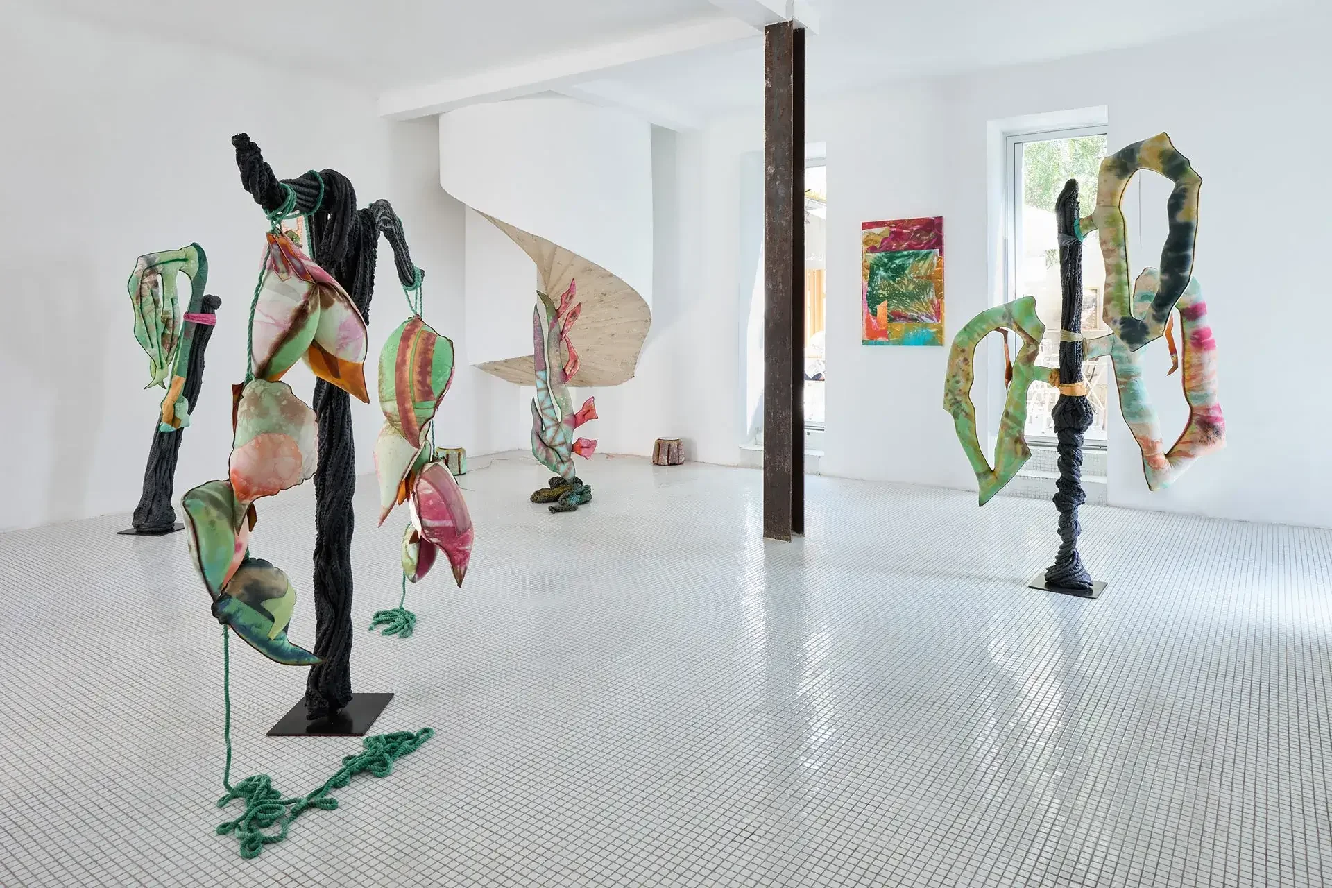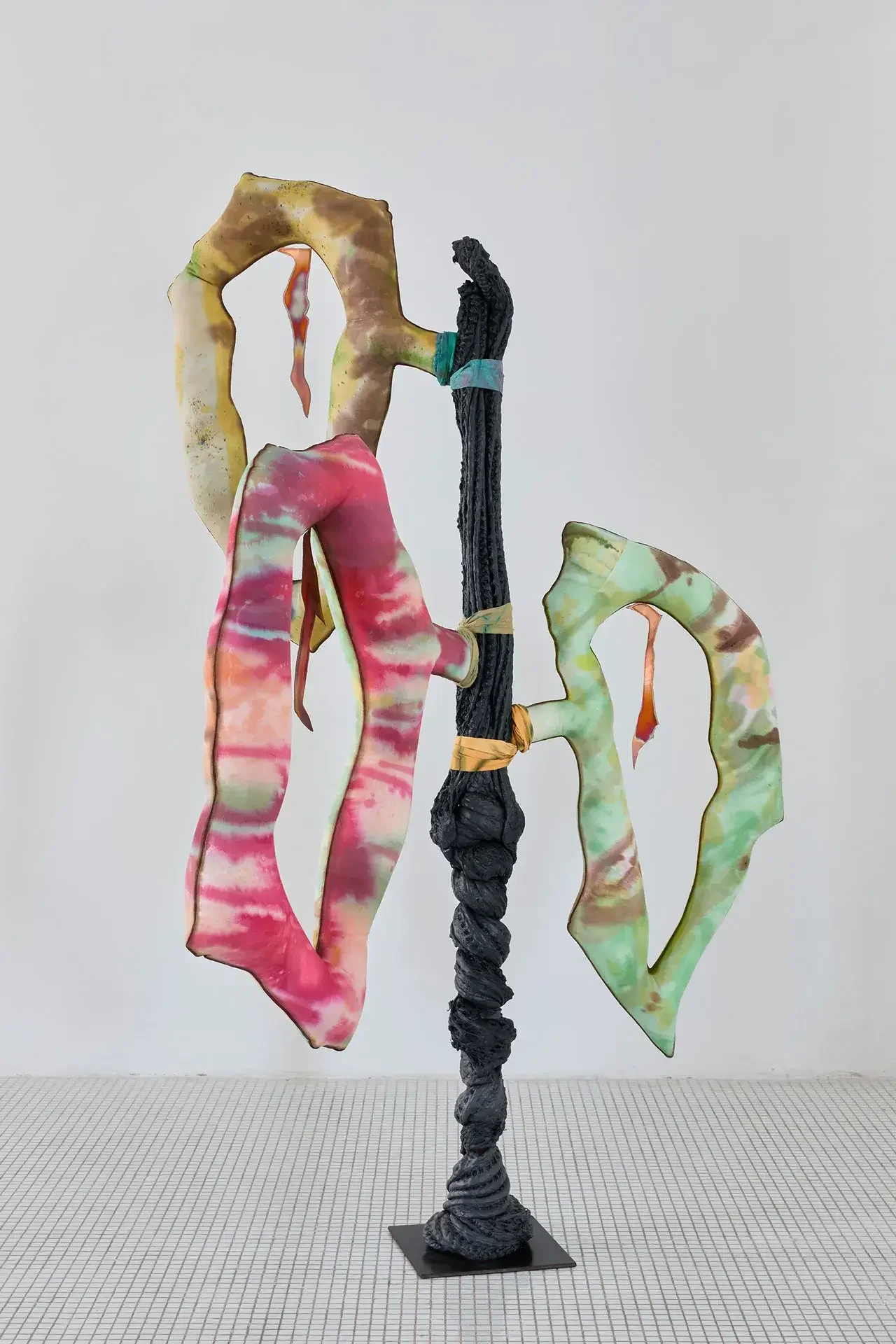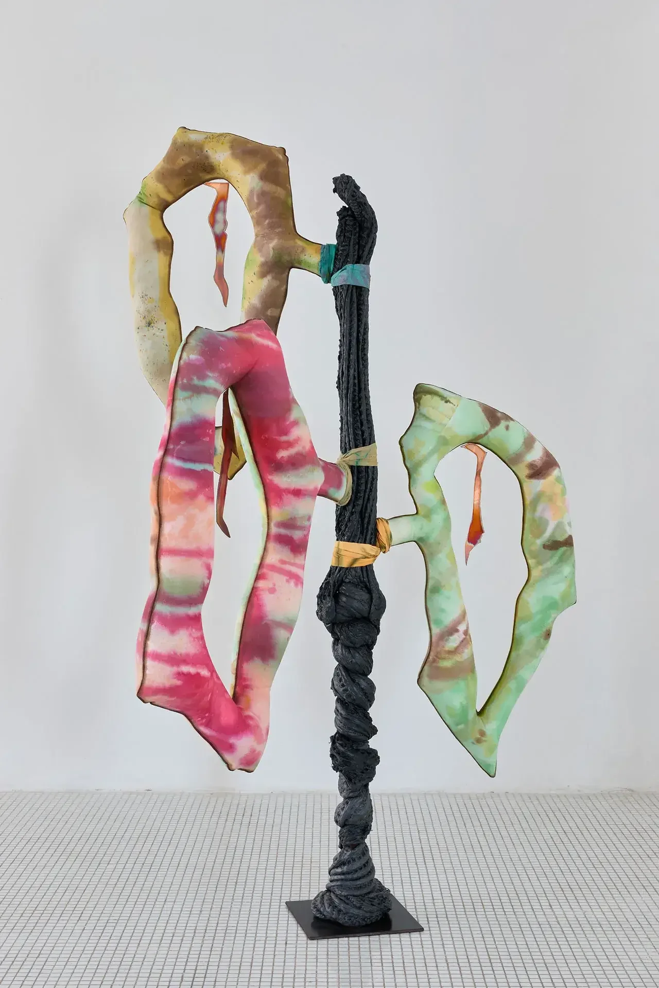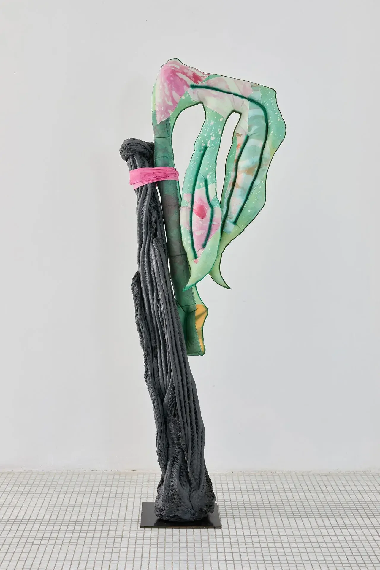 The sculptures invoke fertility through aerial seeds, made from textiles inflated with expanding foam — disproportionate and almost exaggeratedly swollen in the space usually reserved for branches. The black trunks supporting them are made of recycled PVC, hot-molded immediately as it leaves the extruder. Guruceaga contorts their rubbery, reptilian texture, recalling the grimly contemporary image of a vehicle tire melted onto asphalt. Seeds (flowers or fruits) and trunks are connected by strips of fabric or suspended ropes, creating an assemblage aesthetic that evokes a body in remission, while the artist employs a surgical and biological lexical field in her titles: La Greffe (The Transplant), 3 Embryos Fire, 2 Hearts 2 Knots.