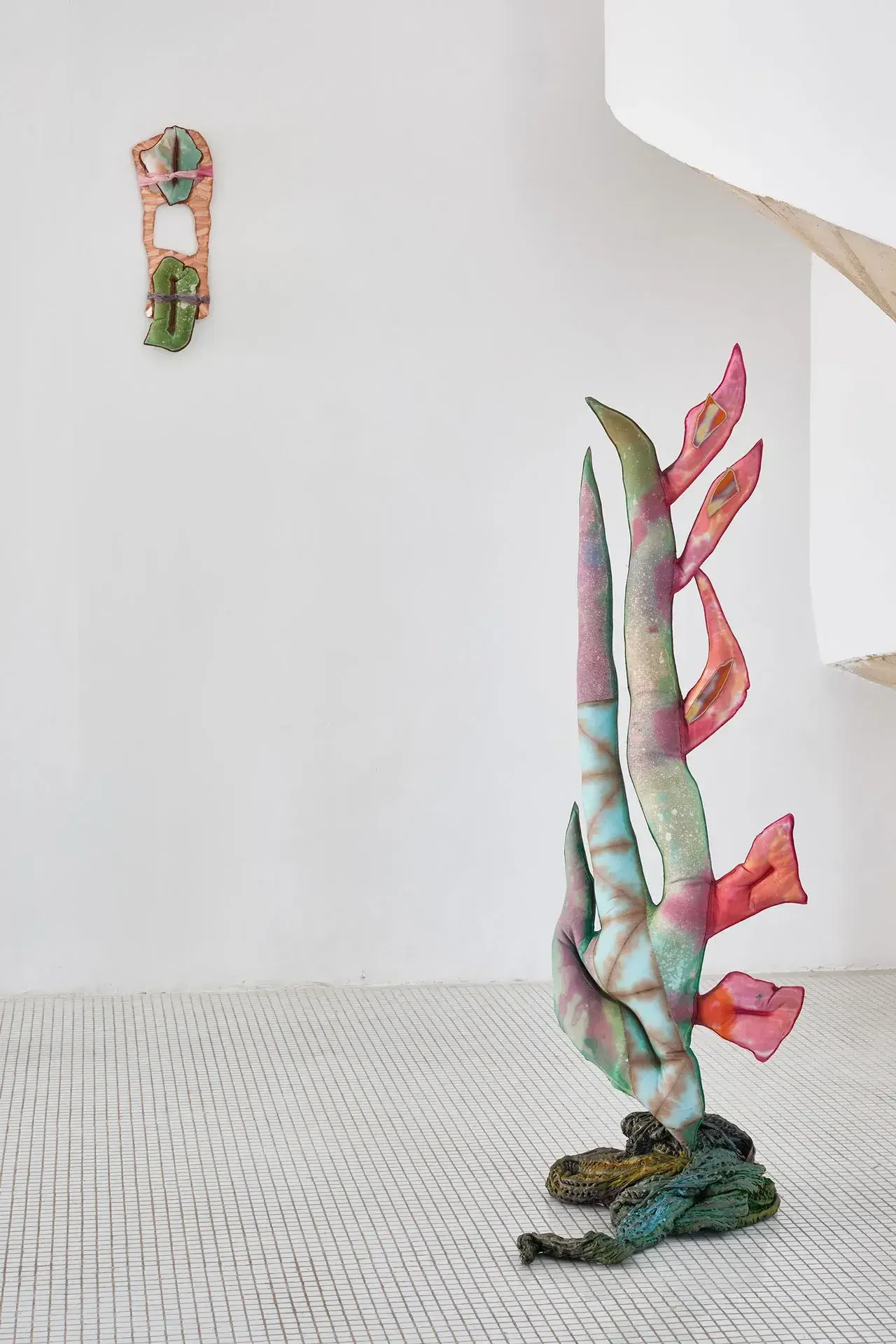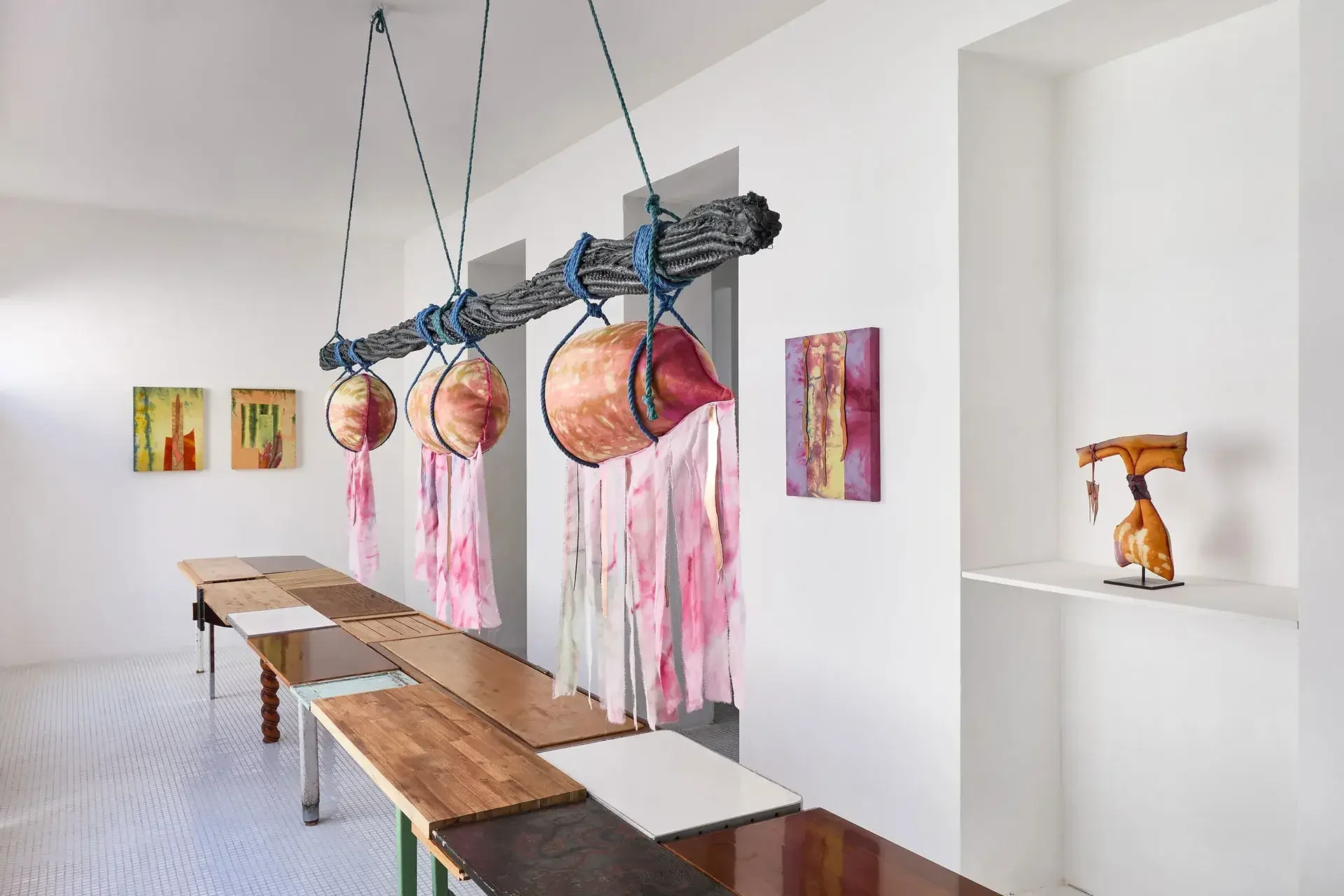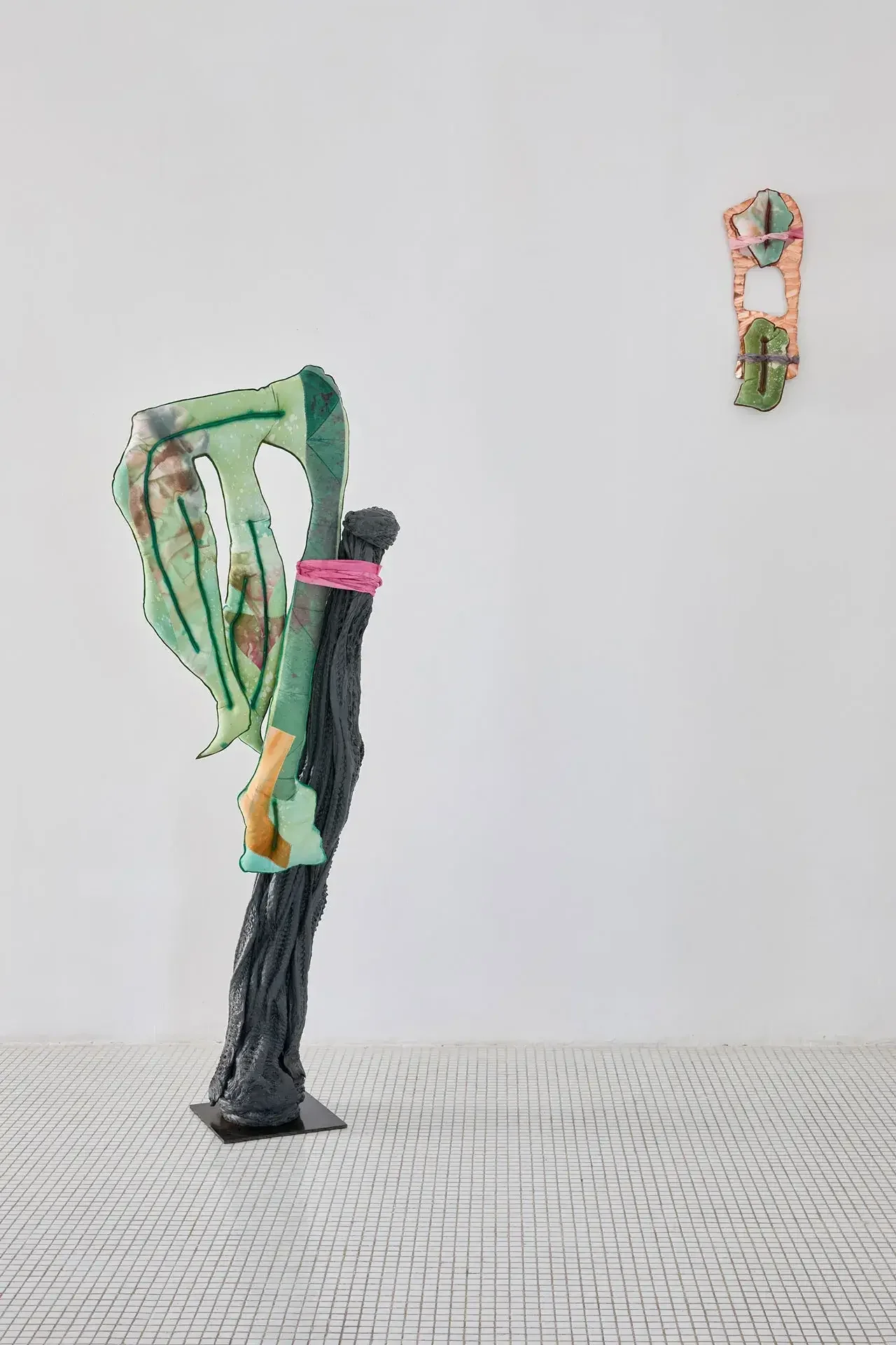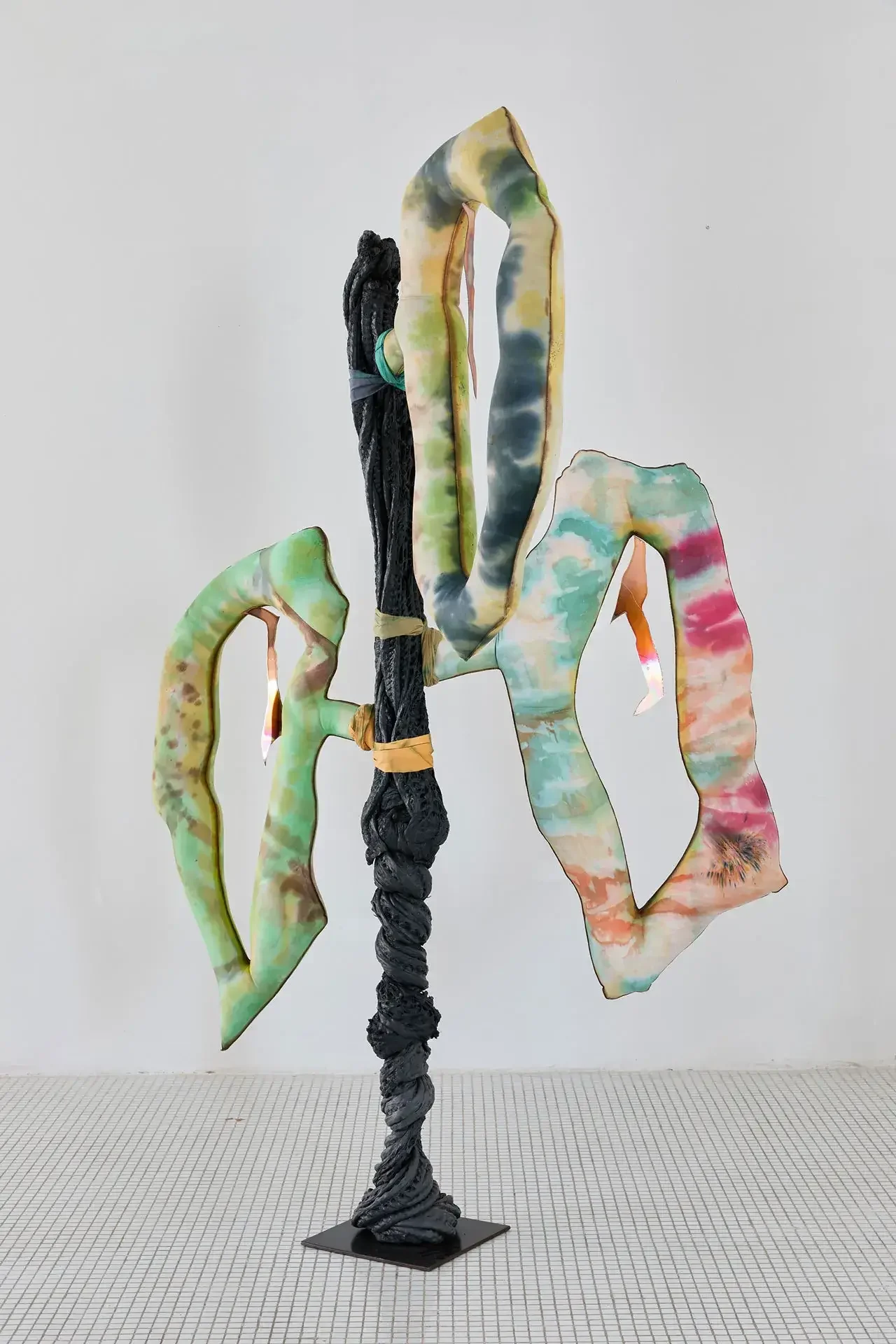 The sculptures invoke fertility through aerial seeds, made from textiles inflated with expanding foam — disproportionate and almost exaggeratedly swollen in the space usually reserved for branches. The black trunks supporting them are made of recycled PVC, hot-molded immediately as it leaves the extruder. Guruceaga contorts their rubbery, reptilian texture, recalling the grimly contemporary image of a vehicle tire melted onto asphalt. Seeds (flowers or fruits) and trunks are connected by strips of fabric or suspended ropes, creating an assemblage aesthetic that evokes a body in remission, while the artist employs a surgical and biological lexical field in her titles: La Greffe (The Transplant), 3 Embryos Fire, 2 Hearts 2 Knots.