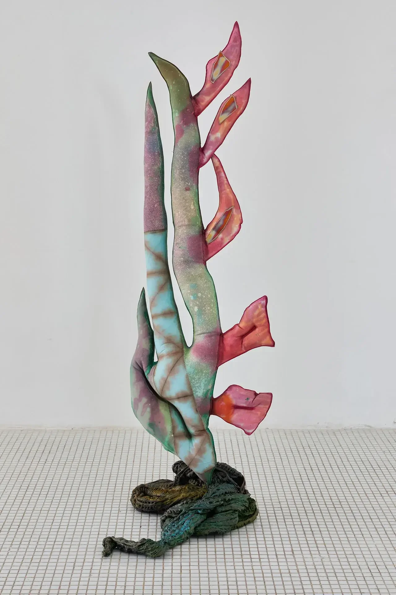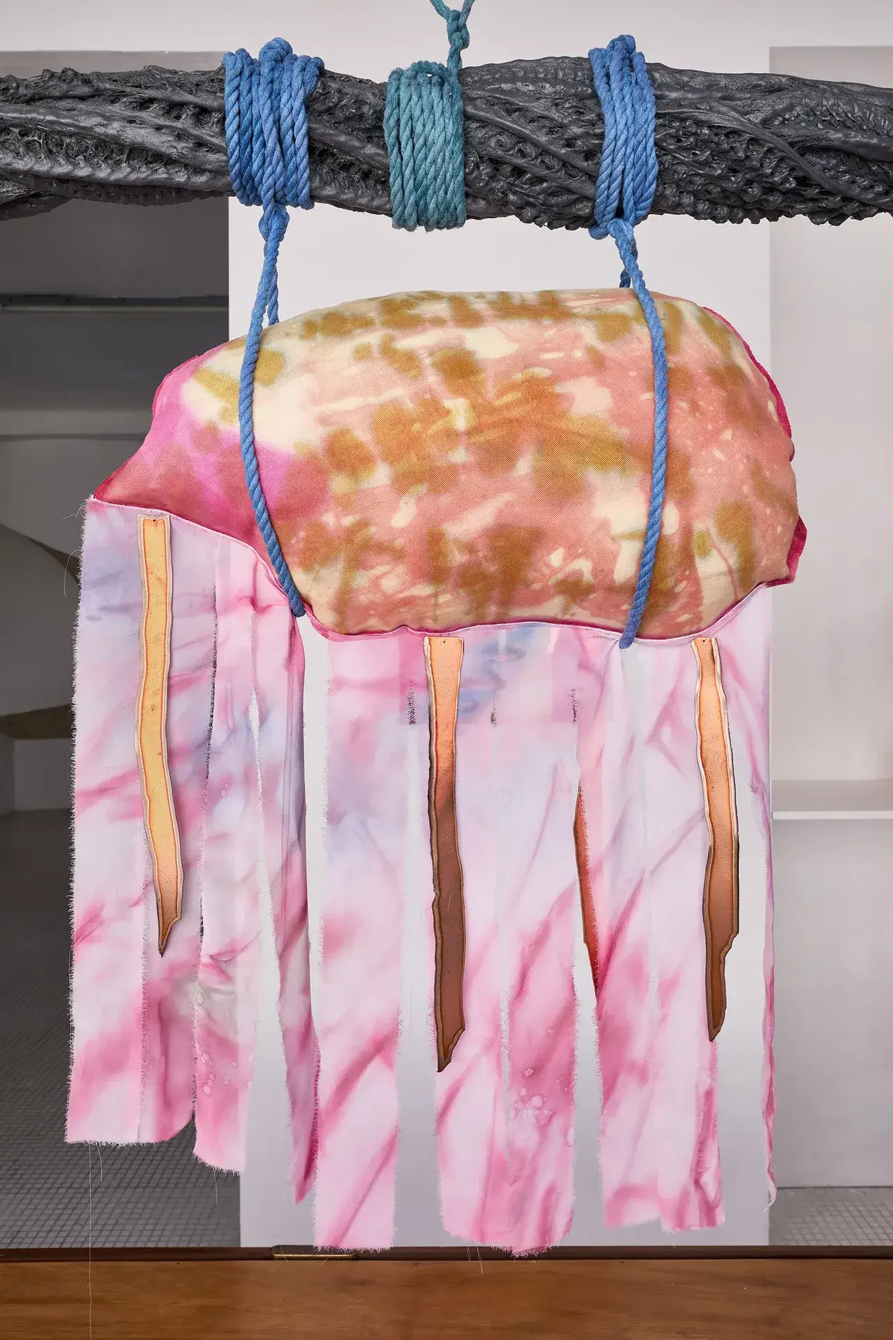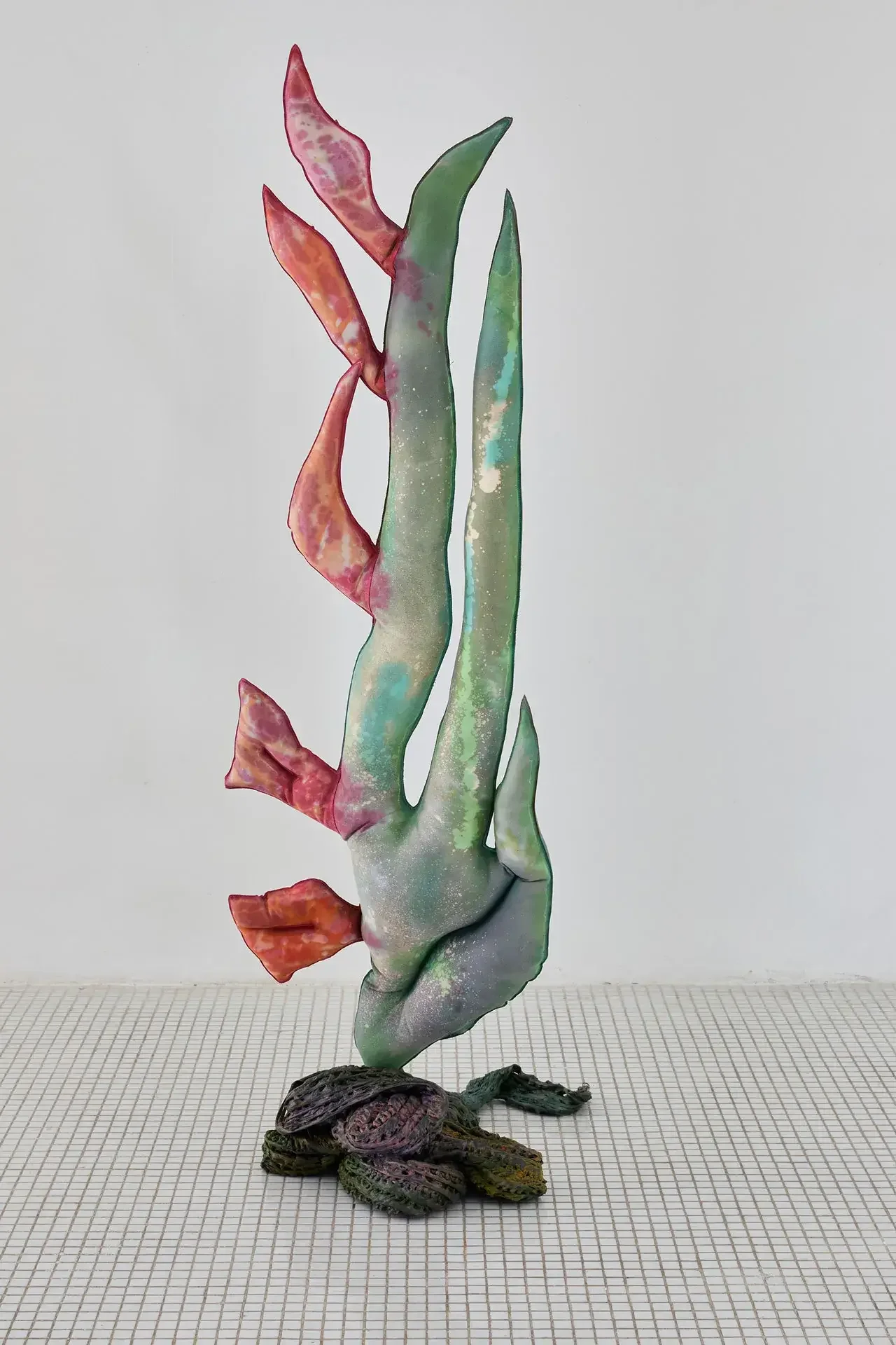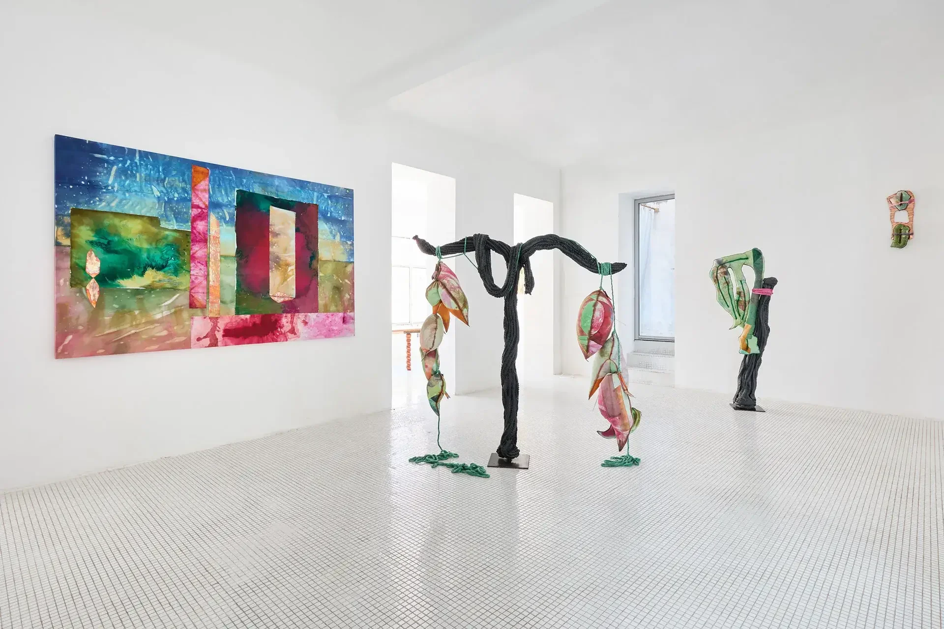 The sculptures invoke fertility through aerial seeds, made from textiles inflated with expanding foam — disproportionate and almost exaggeratedly swollen in the space usually reserved for branches. The black trunks supporting them are made of recycled PVC, hot-molded immediately as it leaves the extruder. Guruceaga contorts their rubbery, reptilian texture, recalling the grimly contemporary image of a vehicle tire melted onto asphalt. Seeds (flowers or fruits) and trunks are connected by strips of fabric or suspended ropes, creating an assemblage aesthetic that evokes a body in remission, while the artist employs a surgical and biological lexical field in her titles: La Greffe (The Transplant), 3 Embryos Fire, 2 Hearts 2 Knots.