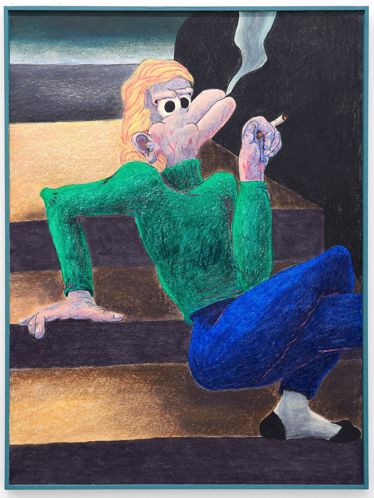 Dans ces dessins faisant appel à des lieux de reconnaissance se manifeste toujours un élément perturbateur : de la présence d’un personnage, d’un objet ou d’une forme à des variations d’échelle, de perspective, de couleur ou encore de l’application de cette dernière. Comme au service des troubles de ces scènes se déploient alors contrastes et textures de couleurs obtenues par l’utilisation de pastels secs et à l’huile.